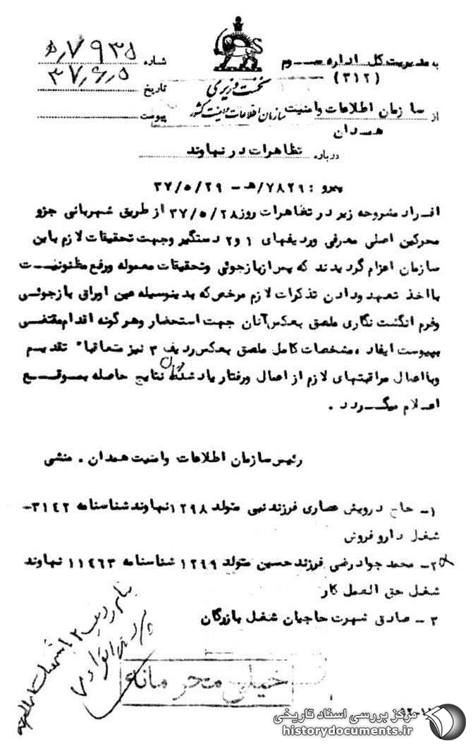 افراد مشروحه زیر در تظاهرات روز 28 /5 /37 از طریق شهربانی جزو محرکین اصلی معرفی و در ردیفهای 1 و ۲ دستگیر و جهت تحقیقات لازم به این سازمان اعزام گردیدند که پس از بازجویی و تحقیقات معموله و رفع مظنونیت با اخذ تعهد و دادن تذکرات لازم مرخص که بدین وسیله عین اوراق بازجویی و فرم انگشت نگاری ملصق به عکس آنان جهت استحضار و هر گونه اقدام مقتضی به پیوست ایفاد، مشخصات کامل ملصق به عکس ردیف ۳ نیز متعاقباً تقدیم و با اعمال مراقبتهای لازم از اعمال و رفتار یادشدگان نتایج حاصله به موقع اعلام میگردد.