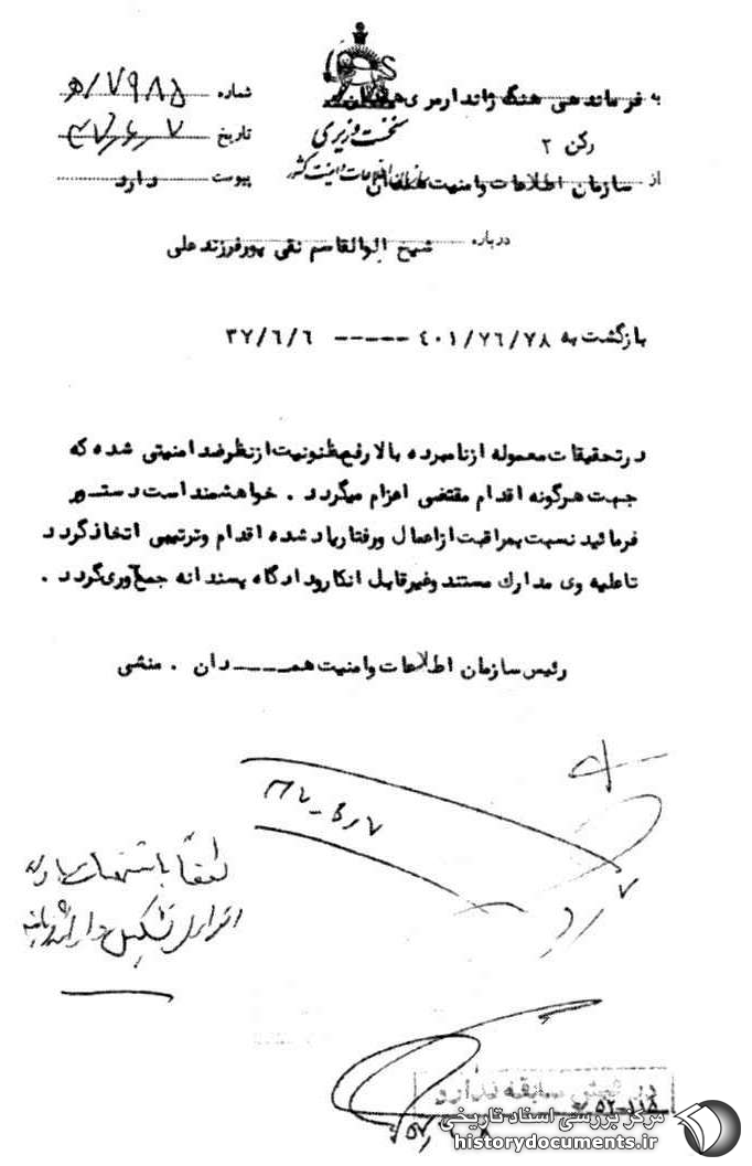 در تحقیقات معموله از نامبرده بالا رفع مظنونیت از نظر ضد امنیتی شده که جهت هرگونه اقدام مقتضی اعزام میگردد. خواهشمند است دستور فرمائید تا نسبت به مراقبت از اعمال و رفتار یاد شده اقدام و ترتیبی اتخاذ گردد تا علیه وی مدارک مستند و غیرقابل انکار و دادگاه پسندانه جمعآوری گردد.