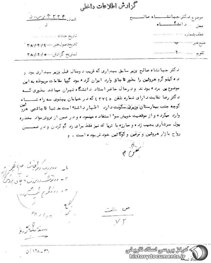 دکتر جهانشاه صالح وزیر سابق بهداری که قریب دو سال قبل وزیر بهداری بود و ده کیلو گرم هروئین را به طور قاچاق وارد ایران کرده بود گویا مقامات مربوطه به این موضوع پیبرده بودند و در حال حاضر استاد دانشگاه تهران میباشد بهطوری که دکتر رضا نقابت دارای شماره تلفن 43745 که در خیابان پهلوی سه راه شاه کوچه... سکونت دارد اظهار داشته است مدتها قاچاقی هروئین وارد میکرده و از موقعیت خویش سوءاستفاده مینموده و در ضمن از فروش مواد مخدره پول سرشاری به جیب زده و مبارزه با تریاک نیز فقط رد گم کردن و در ضمن رواج بازار هروئین و مرفین و کوکائین خودش بوده است.