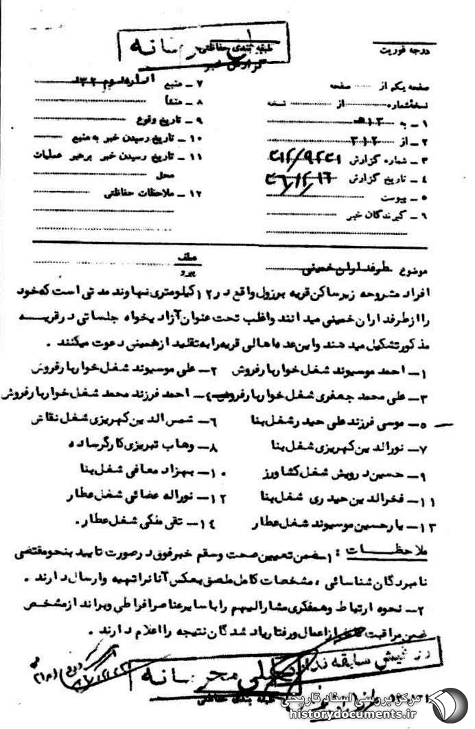افراد مشروحه زیر ساکن قریه برزول واقع در ۱۲ کیلومتری نهاوند مدتی است که خود را از طرفدارن خمینی میدانند و اغلب تحت عنوان آزادی خواه جلساتی در قریه مذکور تشکیل میدهند و این عده اهالی قریه را به تقلید از خمینی دعوت میکنند.