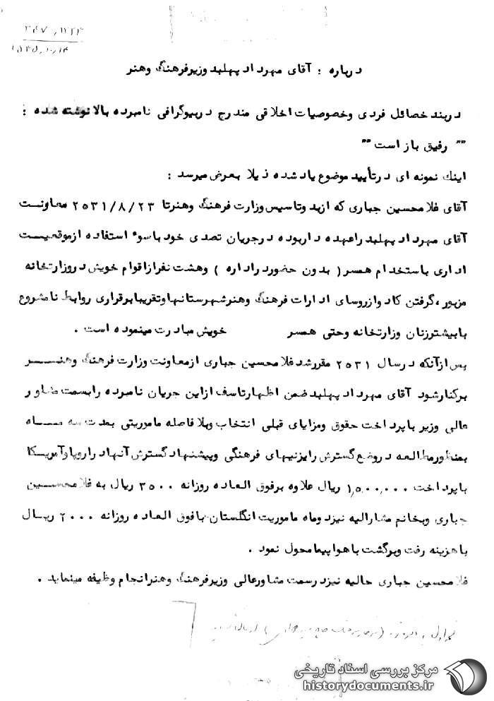 آقای غلامحسین جباری که از بدو تأسیس وزارت فرهنگ و هنر تا 23 /8 /2531 معاونت آقای مهرداد پهلبد را عهدهدار بوده در جریان تصدی خود با سوءاستفاده از موقعیت اداری به استخدام همسر (بدون حضور در اداره) و هشت نفر از اقوام خویش در وزارتخانه مزبور، گرفتن کادو از رؤسای ادارات فرهنگ و هنر شهرستانها و تقریباً برقراری روابط نامشروع با بیشتر زنان وزارتخانه و حتی همسر … خویش مبادرت مینموده است.