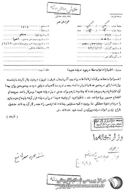 اخیراً نواب صفا مدیرکل اداره اطلاعات و رادیوی آذربایجان شرقی (تبریز) در منزل وقار کارمند بازنشسته وزارت دارائی در حضور عدهای اظهار داشت: به حدی در دستگاههای دولتی دزدی و بخوربخور رواج پیدا کرده و اوضاع درهم و برهم شده که چنانچه باز هم برای مدتی دیگر دولت هویدا بر سرکار باشد سروصدا و افتضاح عجیبی برپا خواهد شد. ناطق افزود: از وقتی که هویدا در رأس دولت قرار گرفته و اوضاع حزب بازی را در تمام شئونات مملکتی شایع نموده کلیه مسئولین و مقامات که از همین راه مصدر کار گردیدهاند مشغول تاراج کردن اموال دولت و پر کردن کیسه خود شدهاند.