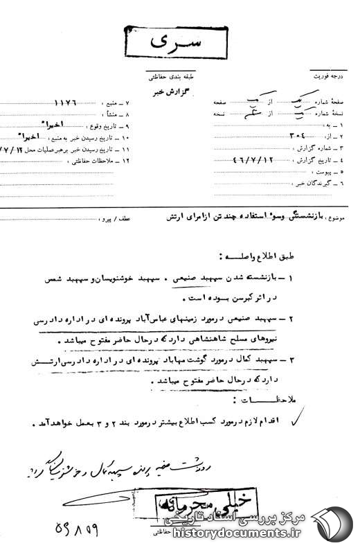 2ـ سپهبد صنیعی در مورد زمینهای عباسآباد پروندهای در اداره دادرسی نیروهای مسلح شاهنشاهی دارد که در حال حاضر مفتوح میباشد.