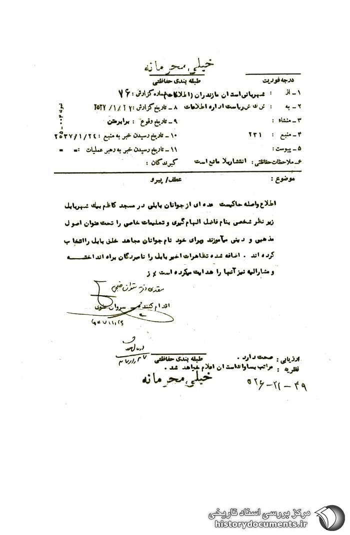 اطلاع واصله حاکی است عدّهای از جوانان بابلی در مسجد کاظمبیک شهر بابل زیر نظر شخصی به نام فاضل1 الهامگیری و تعلیمات خاصی را تحت عنوان اصول مذهبی و دینی میآموزند و برای خود نام جوانان مجاهد خلق بابل را انتخاب کردهاند. اضافه شده تظاهرات اخیر بابل را نامبردگان به راه انداخته و مشارالیه نیز آنها را هدایت میکرده است. ز