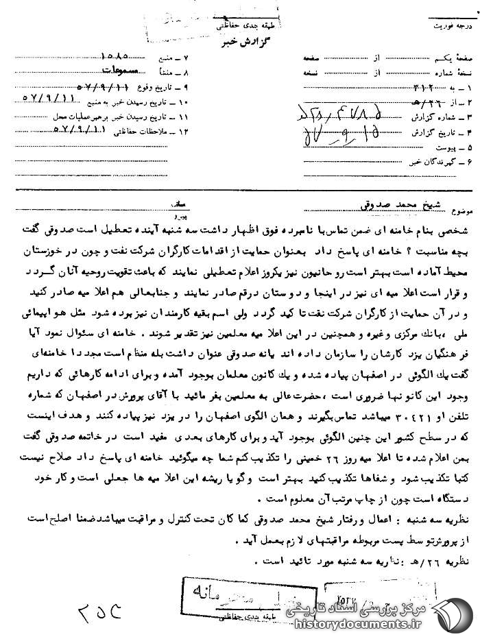 شخصی به نام خامنهای ضمن تماس با نامبرده فوق اظهار داشت: سه شنبه آینده تعطیل است. صدوقی گفت به چه مناسبت؟ خامنهای پاسخ داد: به عنوان حمایت از اقدامات کارگران شرکت نفت و چون در خوزستان محیط آماده است، بهتر است روحانیون نیز یک روز اعلام تعطیلی نمایند که باعث تقویت روحیه آنان گردد و قرار است اعلامیهای نیز در اینجا و دوستان در قم صادر نمایند و جنابعالی هم اعلامیه صادر کنید و در آن حمایت از کارگران شرکت نفت تاکید گردد، ولی اسم بقیه کارمندان نیز برده شود مثل هواپیمائی ملی، بانک مرکزی و غیره و همچنین در این اعلامیه معلمین نیز تقدیر شوند. خامنهای سؤال نمود: آیا فرهنگیان یزد کارشان را سازمان دادهاند یا نه؟ صدوقی عنوان داشت: بله منظم است. مجدداً خامنهای گفت: یک الگوئی در اصفهان پیاده شده و یک کانون معلمان به وجود آمده و برای ادامه کارهائی که داریم وجود این کانونها ضروری است، حضرت عالی به معلمین بفرمائید با آقای پرورش در اصفهان که شماره تلفن او 30421 میباشد، تماس بگیرند و همان الگوی اصفهان را در یزد نیز پیاده کنند و هدف این است که در سطح کشور این چنین الگوئی به وجود آید و برای کارهای بعدی مفید است. در خاتمه صدوقی گفت: به من اعلام شده تا اعلامیه روز 26 خمینی را تکذیب کنم، شما چه میگوئید؟ خامنهای پاسخ داد: صلاح نیست کتباً تکذیب شود و شفاهاً تکذیب کنید بهتر است و گویا ریشه این اعلامیهها جعلی است و کار خود دستگاه است چون از چاپ مرتب آن معلوم است.