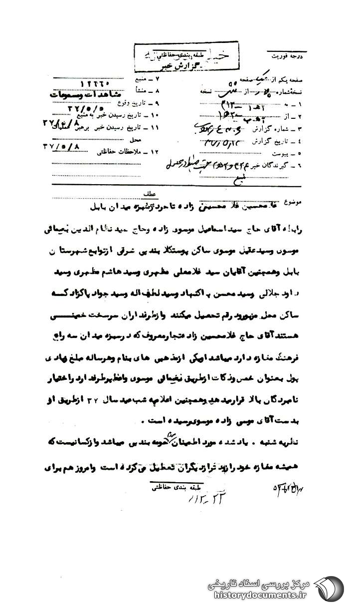 رابط آقای حاج سیداسماعیل موسویزاده و حاج سیدنظامالدین یغمائی [نعیمائی] موسوی و سیدعقیل موسوی ساکن پوستکلا بندپی شرقی از توابع شهرستان بابل و همچنین آقایان سیدغلامعلی مظهری1 و سیدهاشم مظهری2 و سیدداود جلالی و سید محسن پاکنهاد3 و سیدلطیفالله و سیدجواد پاکزاد که ساکن محل مزبور و در قم تحصیل میکنند و از طرفداران سرسخت خمینی هستند آقای حاج غلامحسینزاده تجار معروف که در سبزهمیدان سهراه فرهنگ مغازهدارد میباشد او یکی از مذهبیهای بِنام و هر ساله مبلغ زیادی پول به عنوان خمس و زکات از طریق یغمائی [نعیمائی] موسوی واعظ پرطرفدار در اختیار نامبردگان بالا قرار میدهد و همچنین اعلامیه شب عید سال 37 از طریق او به دست آقای موسیزاده موسوی رسیده است.
