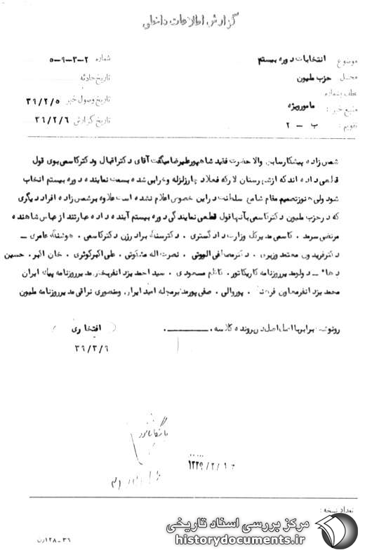 شمسزاده پیشکار سابق والاحضرت فقید شاپور علیرضا میگفت آقای دکتر اقبال و دکتر کاسمی به وی قول قطعی دادهاند که از شهرستان لار که فعلاً دچار زلزله و خرابی شده به سمت نماینده دوره بیستم انتخاب شود ولی هنوز تصمیم مقام شامخ سلطنت در این خصوص اعلام نشده است. علاوه بر شمسزاده افراد دیگری که در حزب ملیون دکتر کاسمی به آنها قول قطعی نمایندگی دوره بیستم آینده داده عبارتند از: عباس شاهنده، مرتضی سرمد، کاسمی مدیرکل وزارت دادگستری، دکتر سنگ برادرزن دکتر کاسمی، هوشنگ عامری، دکتر فریدون معتمد وزیری، دکتر مصطفی الموتی، نصرتاله مشکوتی، علیاکبر کوثری، خان اکبر، حسین دهاء ـ دولو مدیر روزنامه کاریکاتور، کاظم مسعودی، سیداحمد یزدانفر بخش مدیر روزنامه ایران، محمد یزدانفر معاون فرهنگ، پوروالی، صفیپور مدیر مجله امید ایران و منصوری نراقی مدیر روزنامه ملیون