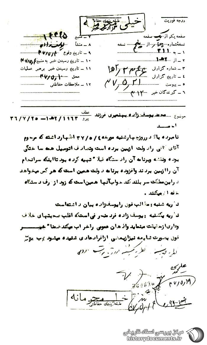 نامبرده بالا در روز چهارشنبه مورخه 4 /5 /37 اظهار داشت که مرحوم آقای کافی1 را دولت از بین برده است و تصادف اتومبیل همه ساختگی بوده و نقشه و برنامه آن را دستگاه قبلاً تهیه کرده بود تا اینکه سرآنجام آن را از بین بردند و افزود برنامه دولت همین است که هرکس میخواهد در این مملکت سر بلند کند جواب آنها همین است که زود از طرف دستگاه خفهاش میکنند.