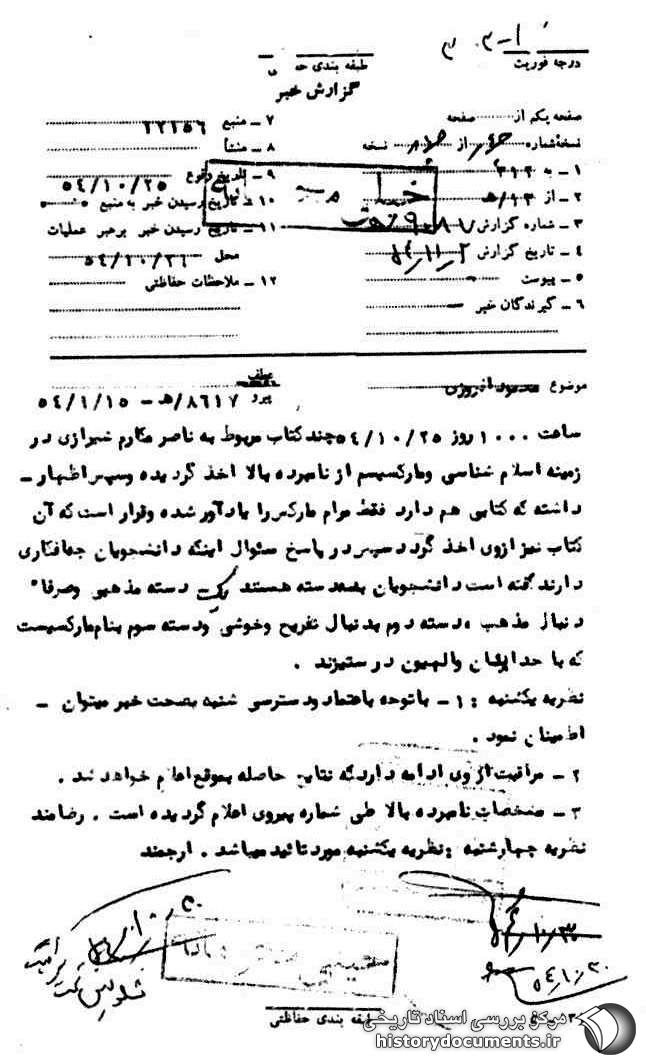 ساعت ۱۰:۰۰ روز 25 /10 /54 چند کتاب مربوط به ناصر مکارم شیرازی در زمینه اسلام شناسی و مارکسیسم از نامبرده بالا اخذ گردیده و سپس اظهار داشته که کتابی هم دارد فقط مرام مارکس را یادآور شده و قرار است که آن کتاب نیز از وی اخذ گردد و سپس در پاسخ سؤال اینکه دانشجویان چه افکاری دارند. گفته است دانشجویان به سه دسته هستند یک دسته مذهبی و صرفاً دنبال مذهب، دسته دوم به دنبال تفریح و خوشی و دسته سوم بنام مارکسیست که با خدائیان و الهیون در ستیزند.
