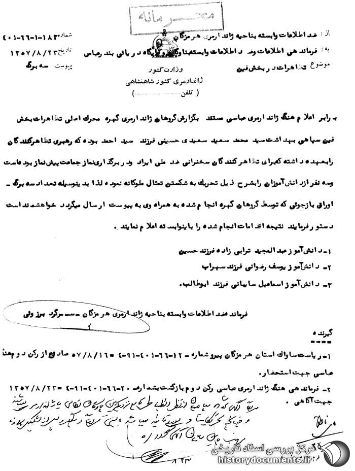 2- فرماندهی هنگ ژاندارمری عباسی رکن دوم بازگشت به شماره 20-66-401-91-4-23 /8 /1357 جهت آگاهی