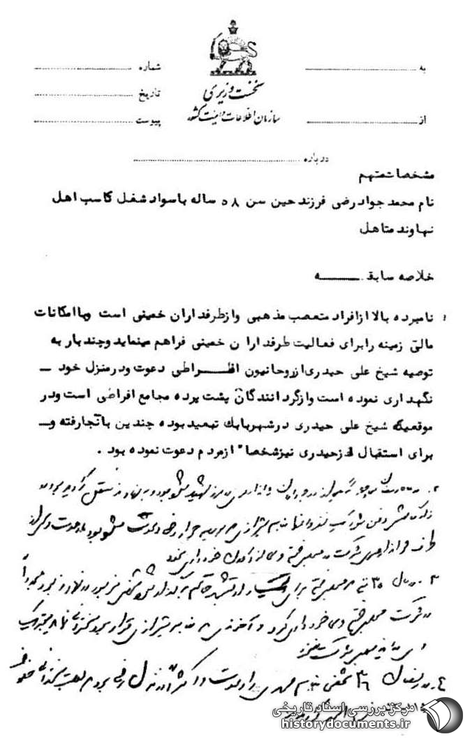۳- در سال ۳۵ نیز که مجلس ختم برای تیمسار ارتشبد خاتم برگزار شد شخص مزبور در نهاوند بود مجدداً از شرکت در مجلس ختم وی خودداری کرد و آخوندی به نام شیرازی قرار بود سخنرانی نماید به تحریک وی در این مجلس شرکت ننمود.
