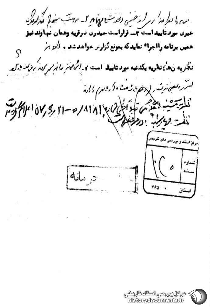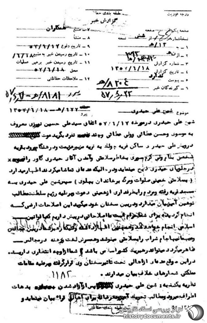 و مردم را به طرفداری از خمینی دعوت مینمایند. ۲- مراتب مندرج در گزارش خبری مورد تایید است. 3- قرار است حیدری در قریه و همان نهاوند نیز همین برنامه را اجرا نماید که به موقع گزارش خواهد شد.