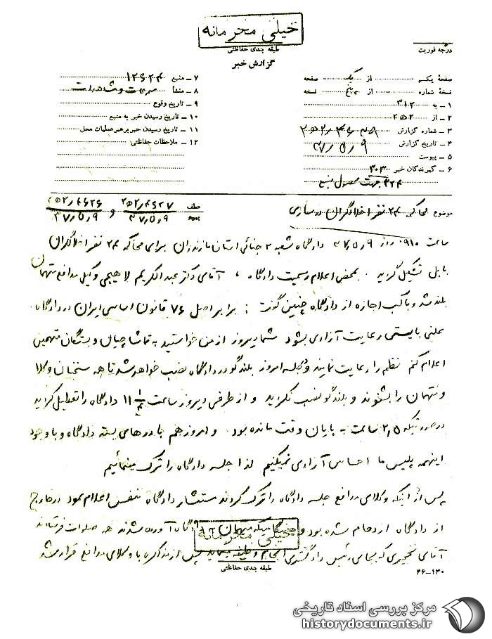 ساعت 0910 روز 9 /5 /37 دادگاه شعبه 2 جنائی استان مازندران برای محاکمه 24 نفر اخلالگران بابل تشکیل گردید. بهمحض اعلام رسمیت دادگاه، آقای دکتر عبدالکریم لاهیجی وکیلمدافع متهمان بلند شد و با کسب اجازه از دادگاه چنین گفت: برابر اصل 76 قانون اساسی ایران در دادگاه علنی باید رعایت آزادی بشود شما دیروز از من خواستید به تماشاچیان و بستگان متهمین اعلام کنم نظم را رعایت نمایند و در جلسه امروز بلندگو در دادگاه نصب خواهد شد تا همه سخنان وکلا و متهمان را بشنوند و بلندگو نصب نکردید و از طرفی دیروز ساعت 11:15 دادگاه را تعطیل کردید در صورتیکه 5 /2 ساعت به پایان وقت مانده بود و امروز هم با درهای بسته دادگاه و با وجود اینهمه پلیس ما احساس آزادی نمیکنیم لذا جلسه دادگاه را ترک مینمائیم.