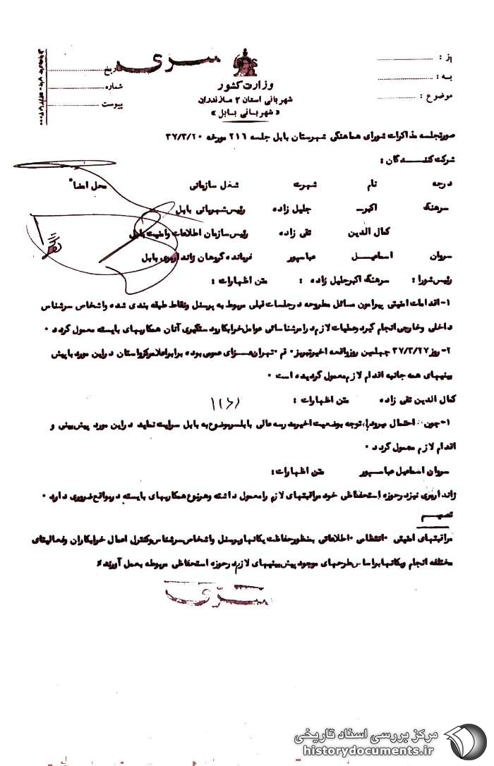 صورتجلسه مذاکرات شورای هماهنگی شهرستان بابل جلسه 216 مورخه 20 /3 / 37