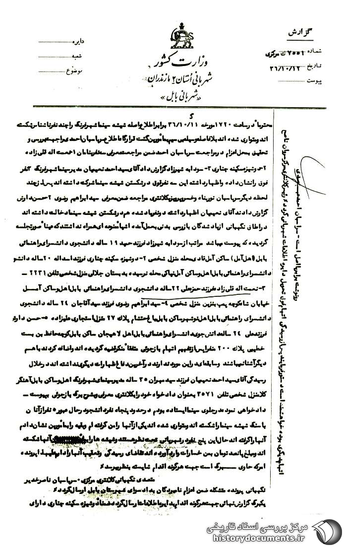 محترماً در ساعت 1720 مورخه 11 /10 /36 برابر اطلاع واصله شیشه سینما شهر فرنگ را چند نفر ناشناس شکستهاند و متواری شدهاند بلافاصله وسیله بی سیم به مأمورین گشت قرارگاه اطلاع سرپاسبان احمدی را جهت بررسی و تحقیق به محل اعزام در مراجعت سرپاسبان احمدی ضمن معرفی سه نفر به نامهای 1- نعمتالله قلیزاده 2- دوشیزه سکینه چناری1 3- سودابه شیرزاد2 گزارش داد آقای سید احمد نعیمیان مدیر سینما شهر فرنگ 3 نفر فوق را نشان داد و اظهار داشت این سه نفر فوق در شکستن شیشه سینما شرکت داشتهاند پس از چند لحظه دیگر سرپاسبان نورپناه و خسرو پرویز به کلانتری مراجعه ضمن معرفی 1- سیدابراهیم رضوی3 2- حسن دارش4 گزارش دادند آقای نعیمیان اظهار داشت دو نفر یادشده هم در شکستن شیشه سینما دخالت داشتهاند. در اتاق نگهبانی از یادشدگان بازرسی بدنی به عمل آمد اشیاء ممنوعهای همراه نداشتند که عیناً صورتجلسه گردیده که پیوست میباشد مراتب از سودابه شیرزاد فرزند حمید 19 ساله دانشجوی دانشسرای راهنمایی بابل (اهل آمل) ساکن آمل قادی محله منزل شخصی 2- دوشیزه سکینه چناری فرزند اسدالله 20 ساله دانشجوی دانشسرای راهنمایی بابل اهل و ساکن آمل نیاکی محله نرسیده به دبستان جلالی منزل شخصی تلفن 2231 3- نعمتالله قلیزاده5 فرزند حمزهعلی 22ساله دانشجوی دانشسرای راهنمایی بابل اهل و ساکن آمل خیابان شاه کوچه پمپبنزین منزل شخصی 4- سیدابراهیم رضوی فرزند سیدآقاجان 24ساله دانشجوی دانشسرای راهنمایی بابل اهل نوشهر ساکن بابل باغ احتشام پلاک 27 منزل استیجاری علیزاده 5- حسن دارش فرزند علی 24 ساله دانشجوی دانشسرای راهنمایی بابل اهل لاهیجان ساکن بابل کوچه حافظ بنبست خطیبی پلاک 200 منفرداً پس از تفهیم اتهام بازجویی متفقاً منکر قضیه گردیدهاند و اضافه کردند با هم دیگر آشنا نمیباشند و سابقهای در این مورد ندارند در آخرین دفاع اظهارات دیگری نداشتهاند در خلال رسیدگی آقای سید احمد نعیمیان فرزند سید مهران 35 ساله مدیر سینمای شهر فرنگ اهل و ساکن بابل آهنگرکلا منزل شخصی تلفن 3571 به عنوان دادخواه خود را به کلانتری معرفی و به شرح برگ بازجویی به پیوست6 دادخواهی نمود در جلوی سینما ایستاده بودم در حدود پنجاه نفر دانشجو در حال عبور 5 نفر از آنان با سنگ شیشه سینما را شکستهاند و متواری شدهاند یکی از آنها را من گرفتهام و بقیه را به مأمورین نشان دادم آنها را گرفتهاند حال این پنج نفر در شهربانی تحت نظر هستند و شیشهها را آنها شکستهاند و مبلغ پانصد تومان به من خسارات وارد آوردهاند تقاضای رسیدگی و تعقیب آنها را دارم علیهذا پرونده امر که حاوی... برگ است جهت هرگونه اقدام شایسته به نظر میرسد.