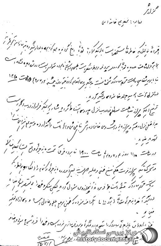 احتراماً همانطوری که خاطر عالی مستحضر است با اینکه کراراً به شهربانی ابلاغ گردیده بود که نامبرده بالا را دستگیر و به این سازمان تحویل نمایند، برابر گزارشات عدیده شهربانی که روی پرونده مربوطه منعکس است، اعلام داشته نامبرده متواری است و در شهر دیده نشده است. بنا به امریه شفاهی ریاست محترم ساواک، شخصاً نسبت به دستگیری وی اقدام، که در نتیجه روز پنجشنبه 2 /7 /49 در ساعت 1345 در منزل آیتالله سیدجواد خامنهای دستگیر گردید.