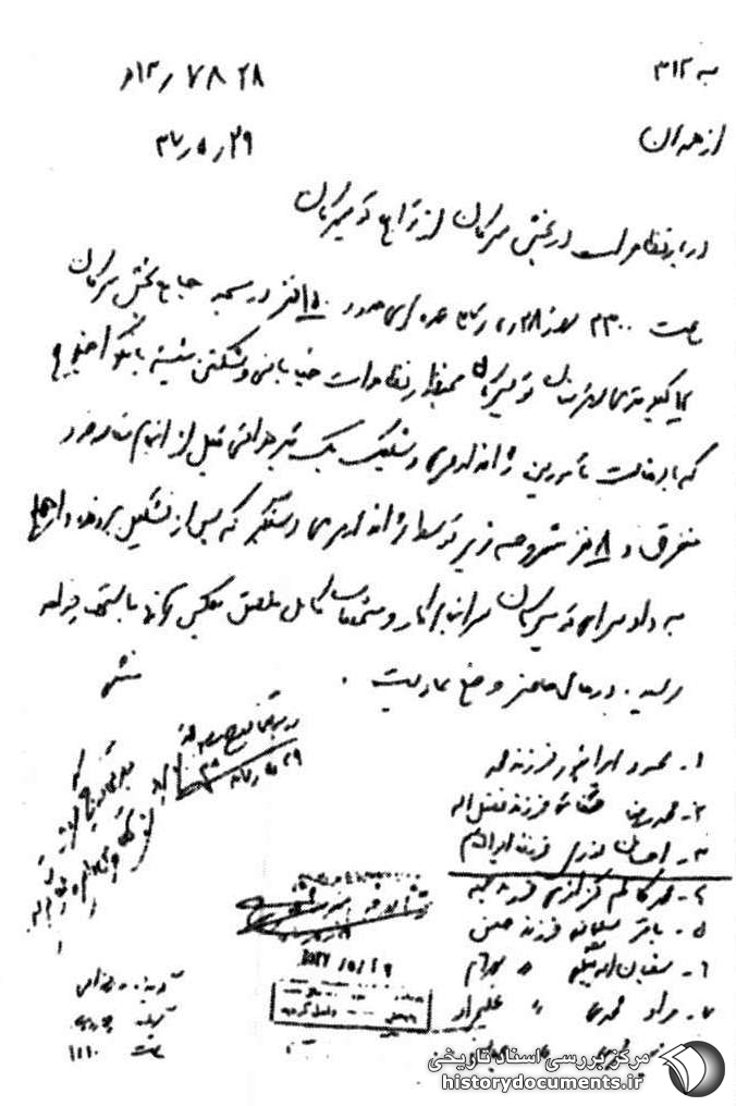 ساعت ۲۳۰۰ روز 28 /5 /37 عدهای حدود ۱۵۰ نفر در مسجد جامع بخش سرکان ۱۲ کیلومتری شهرستان تویسرکان به منظور تظاهرات خیابانی و شکستن شیشه بانکها اجتماع که با دخالت مأمورین ژاندارمری و شلیک یک تیر هوائی قبل از انجام مقاصد خود متفرق و ۸ نفر مشروحه زیر توسط ژاندارمری دستگیر که پس از تشکیل پرونده و ارجاع به دادسرای تویسرکان سرانجام کار و مشخصات کامل ملصق به عکس آنها باستحضار خواهد رسید. در حال حاضر وضع عادیست.