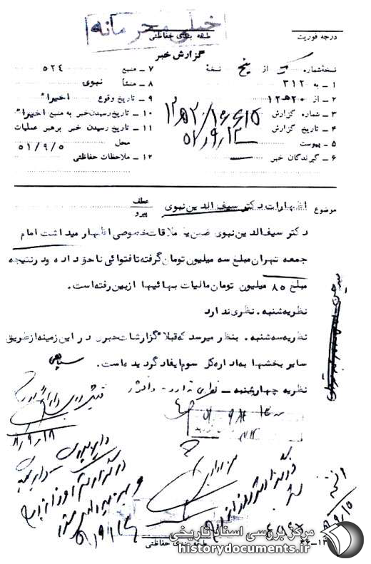دکتر سیفالدین نبوی ضمن یک ملاقات خصوصی اظهار میداشت امام جمعه تهران مبلغ سه میلیون تومان گرفته تا فتوایی ناحق داده و در نتیجه مبلغ 85 میلیون تومان مالیات بهائیها از بین رفته است.