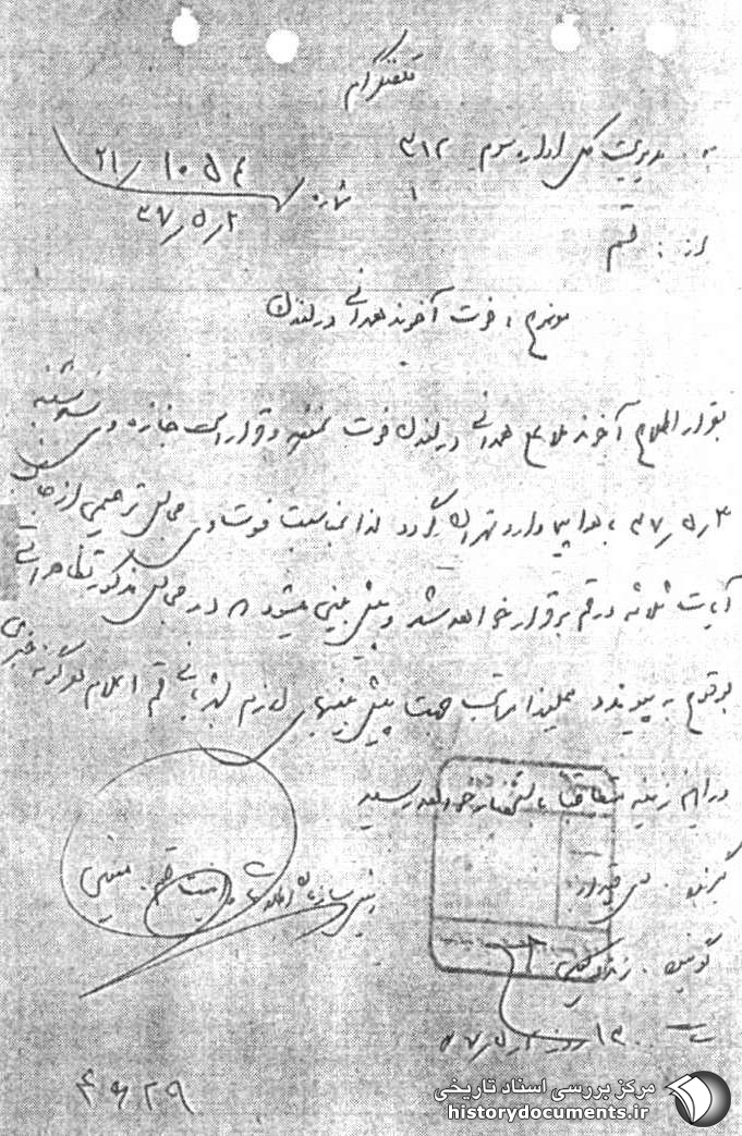 بقرار اطلاع آخوند ملاعلی همدانی در لندن فوت نموده و قرار است جنازه وی سه شنبه 3 /5 /37 با هواپیما وارد تهران گردد لذا به مناسبت فوت وی مجالس ترحیمی از جانب آیات ثلاثه در قم برقرار خواهد شد و پیشبینی میشود در مجالس مذکور تظاهراتی به وقوع بپیوندند علیهذا مراتب جهت پیشبینیهای لازم به شهربانی قم اعلام هرگونه خبری در این زمینه متعاقباً به استحضار خواهد رسید.