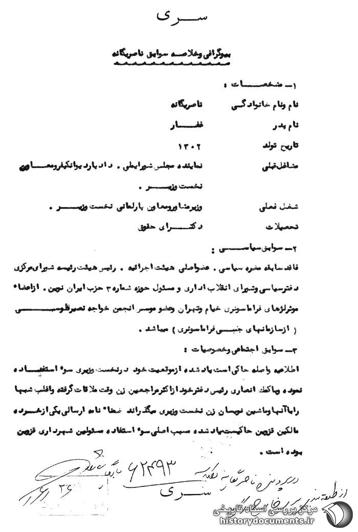 اطلاعیه واصله حاکی است یادشده از موقعیت خود در نخستوزیری سوءاستفاده نموده و با کمک انصاری رئیس دفتر خود از اکثر مراجعین زن وقت ملاقات گرفته و اغلب شبها را با آنها و ماشیننویسان زن نخستوزیری میگذراند ضمناً نامه ارسالی یکی از خرده مالکین قزوین حاکی است یادشده مسبب اصلی سوءاستفاده مسئولین شهرداری قزوین بوده است.