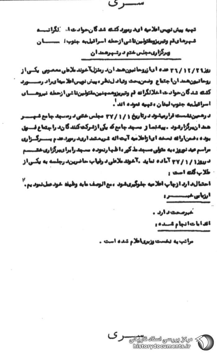 تهیه پیش نویس اعلامیه ای در مورد کشته شدگان حوادث اخلالگرانه شهرهای قم و تبریز و مقتولین ناشی از حمله اسرائیل به جنوب لبنان و برگزاری مجلس ختم در شهر همدان