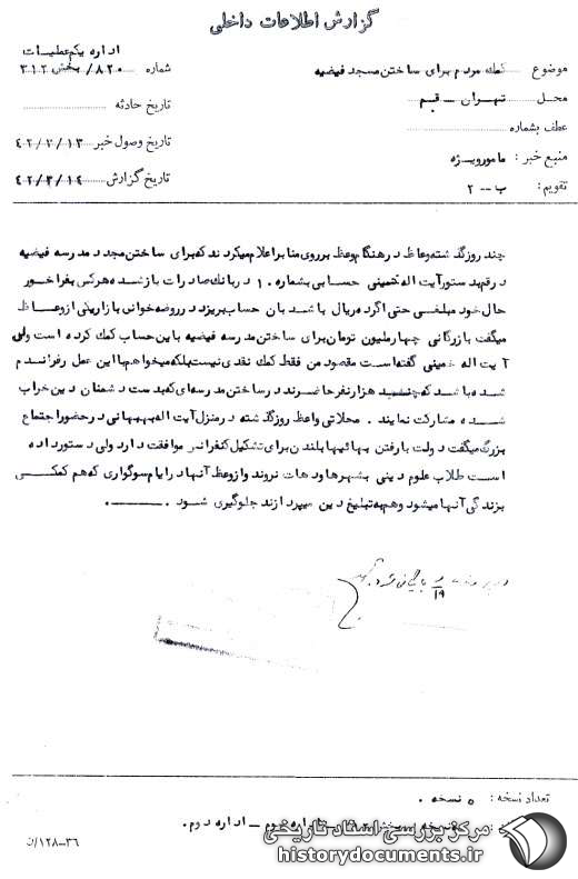 چند روز گذشته وعاظ در هنگام وعظ به روی منابر اعلام میکردند که برای ساختن مجدد مدرسه فیضیه در قم به دستور آیتالله خمینی حسابی به شماره 10 در بانک صادرات باز شده، هرکس به فراخور حال خود مبلغی حتی اگر ده ریال باشد به آن حساب بریزد. در روضهخوانی بازار یکی از وعاظ میگفت بازرگانی چهار میلیون تومان برای ساختن مدرسه فیضیه به این حساب کمک کرده است، ولی آیتالله خمینی گفته است مقصود من فقط کمک نقدی نیست بلکه میخواهم با این عمل رفراندم شده باشد که چند هزار نفر حاضرند در ساختن مدرسهای که به دست دشمنان دین خراب شده مشارکت نمایند. محلاتی واعظ روز گذشته در منزل آیتالله بهبهانی در حضور اجتماع بزرگ میگفت دولت با رفتن بهائیها به لندن برای تشکیل کنفرانس موافقت دارد، ولی دستور داده است طلاب علوم دینی به شهرها و دهات نروند و از وعظ آنها در ایام سوگواری که هم کمکی به زندگی آنها میشود و هم به تبلیغ دین میپردازند جلوگیری شود.