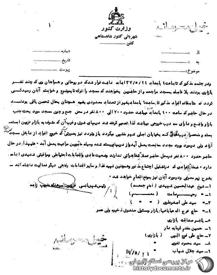 در حال حاضر که ساعت 900 بامداد میباشد حدود 700 الی 800 نفر در محل جمع و چون مسجد مورد بحث جنب بازار واقع و دارای سه درب خروجی میباشد لذا تصمیم گرفته شد دربهای شرق و غرب آن که مشرف به بازار قزوین است بسته و منحصراً درب بقالی که به خیابان اصلی شهر منتهی میگردد باز و تردد نیز به صورتی باشد که خروج افراد از داخل مسجد به صورت انفرادی آزاد ولی در مورد ورود مجدد ممانعت به عمل آید و از دربهای بسته شده وسیله مأمورین مراقبت به عمل آمد.