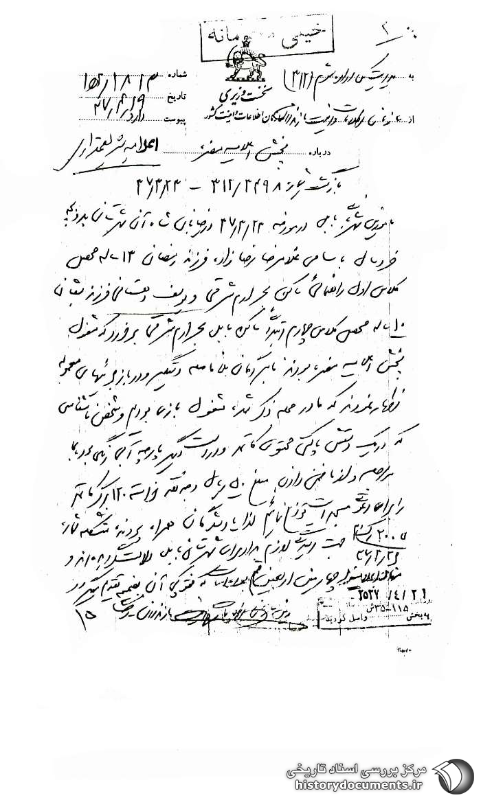 مأمورین شهربانی بابل در مورخه 23 / 3 /37 در خیابان شاه آن شهرستان به دو بچه خردسال به اسامی غلامرضا رضازاده،1 فرزند رمضان 13 ساله محصّل کلاس اول راهنمائی ساکن بحر ارم شرقی و یوسف دهستانی،2 فرزند شعبان، 10 ساله محصّل، کلاس چهارم ابتدائی ساکن بابل بحر ارم شرقی برخورد که مشغول پخش اعلامیه مضرّه بودند، نامبردگان بلافاصله دستگیر و در بازجوییهای معموله اظهار نمودند که ما در محلّه ذکر شده مشغول بازی بودیم و شخص ناشناسی که در یک دستش پاکتی محتوی کاغذ و در دست دیگر پارچه آبیرنگی بود، به ما مراجعه و از ما ضمن دادن مبلغ 50 ریال وجه نقد خواسته 120 برگ کاغذ را [که] برای دعوتی مسجد است توزیع نمائیم. لذا یادشدگان همراه پرونده متشکله شماره 2005 / ک / م – 26 /3 /37 جهت رسیدگی لازم به ژاندارمری شهرستان بابل دلالت گردیدهاند و مفاد اعلامیه (چهارمین اربعین قم) بوده است که فتوکپی آن به ضمیمه تقدیم میگردد.
