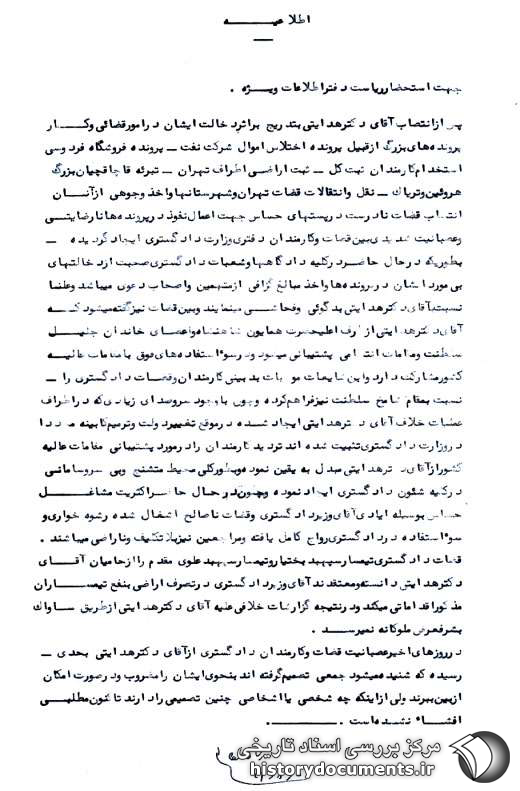 پس از انتصاب آقای دکتر هدایتی، به تدریج بر اثر دخالت ایشان در امور قضائی و کار پروندههای بزرگ از قبیل: پرونده اختلاس اموال شرکت نفت ـ پرونده فروشگاه فردوسی - استخدام کارمندان ثبت کل ـ ثبت اراضی اطراف تهران ـ تبرئه قاچاقچیان بزرگ هروئین و تریاک ـ نقل و انتقالات قضات تهران و شهرستانها و اخذ وجوهی از آنان - انتصاب قضات نادرست در پستهای حساس جهت اعمال نفوذ در پروندهها، نارضایتی و عصبانیت شدیدی بین قضات و کارمندان دفتری وزارت دادگستری ایجاد گردیده. به طوری که در حال حاضر، در کلیه دادگاهها و شعبات دادگستری، صحبت از دخالتهای بیمورد ایشان در پروندهها و اخذ مبالغ گزافی از متهمین و اصحاب دعوی میباشد و علناً نسبت به آقای دکتر هدایتی بدگویی و فحاشی مینمایند و بین قضات نیز گفته میشود که: آقای دکتر هدایتی از طرف اعلیحضرت همایون شاهنشاه و اعضای خاندان جلیل سلطنت و مقامات انتصابی پشتیبانی میشود و در سوءاستفادههای فوق با مقامات عالیه کشور مشارکت دارد و این شایعات موجبات بدبینی کارمندان و قضات دادگستری را نسبت به مقام شامخ سلطنت نیز فراهم کرده و چون با وجود سروصدای زیادی که در اطراف عملیات خلاف آقای دکتر هدایتی ایجاد شده، در موقع تغییر دولت و ترمیم کابینه، مجدداً در وزارت دادگستری تثبیت شدهاند، تردید کارمندان را در مورد پشتیبانی مقامات عالیه کشور از آقای دکتر هدایتی مبدل به یقین نموده و بهطور کلی محیط متشنج و بی سروسامانی در کلیه شئون دادگستری ایجاد نموده و چون در حال حاضر اکثریت مشاغل حساس به وسیله ایادی آقای وزیر دادگستری و قضات ناصالح اشغال شده، رشوهخواری و سوءاستفاده در دادگستری رواج کامل یافته و مراجعین نیز بلاتکلیف و ناراضی میباشند.