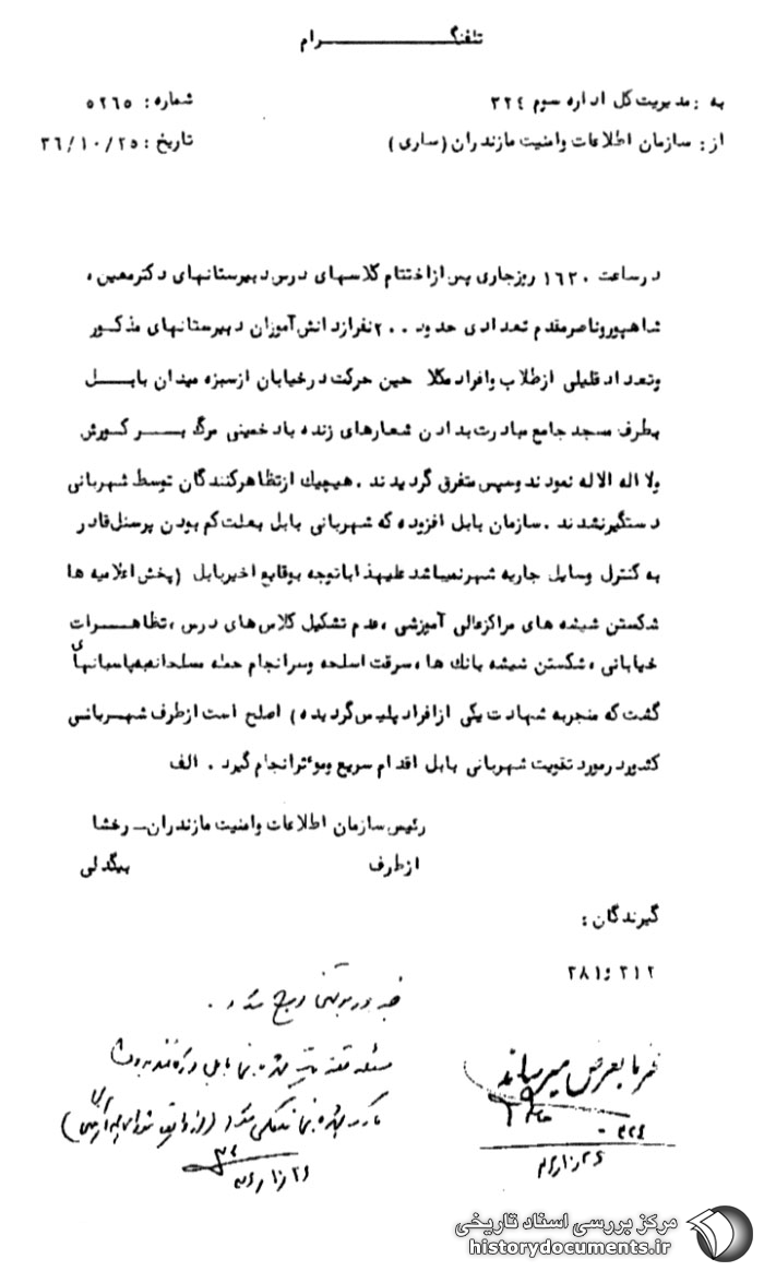 در ساعت 16:30 روز جاری پس از اختتام کلاسهای درس دبیرستانهای دکتر معین، شاهپور و ناصر مقدّم تعدادی حدود 200 نفر از دانشآموزان دبیرستانهای مذکور و تعداد قلیلی از طلاب و افراد مکّلا حین حرکت در خیابان از سبزهمیدان بابل به طرف مسجد جامع مبادرت به دادن شعارهای زنده باد خمینی مرگ بر کورش1 و لااله الاّ الله نمودند و سپس متفرق گردیدند. هیچ یک از تظاهرکنندگان توسط شهربانی دستگیر نشدند. سازمان بابل افزوده که شهربانی بابل به علّت کم بودن پرسنل قادر به کنترل وسایل جاریه شهر نمیباشد علیهذا با توجه به وقایع اخیر بابل (پخش اعلامیهها، شکستن شیشههای مراکز عالی آموزشی، عدم تشکیل کلاسهای درس، تظاهرات خیابانی، شکستن شیشه بانکها، سرقت اسلحه و سرآنجام حمله مسلّحانه به پاسبانهای گشت که منجر به شهادت یکی از افراد پلیس گردید) اصلح است از طرف شهربانی کشور در مورد تقویت شهربانی بابل اقدام سریع و موثر آنجام گیرد. الف