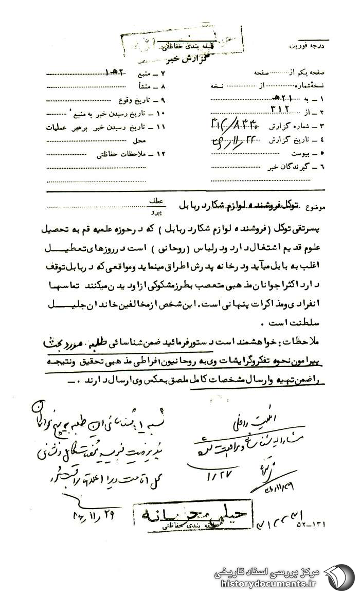 پسر تقی توکل (فروشنده لوازم شکار در بابل) که در حوزه علمیّه قم به تحصیل علوم قدیم اشتغال دارد و در لباس (روحانی) است در روزهای تعطیل اغلب به بابل میآید و در خانه پدرش اطراق مینماید و مواقعی که در بابل توقف دارد اکثراً جوانان مذهبی متعصّب بطرز مشکوکی از او دیدن میکنند تماسها انفرادی و مذاکرات پنهانی است. این شخص از مخالفین خاندان جلیل سلطنت است.