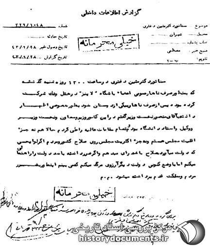 بررسى گردید و در موقع[مناسب]در گزارش از آن بهرهبردارى خواهد شد فعلاً اقدامى ندارد در پروندهاى مربوطه بایگانى گردید این اطلاعیه در پرونده دکتر احمد متین دفترى بایگانى شود. احمدى