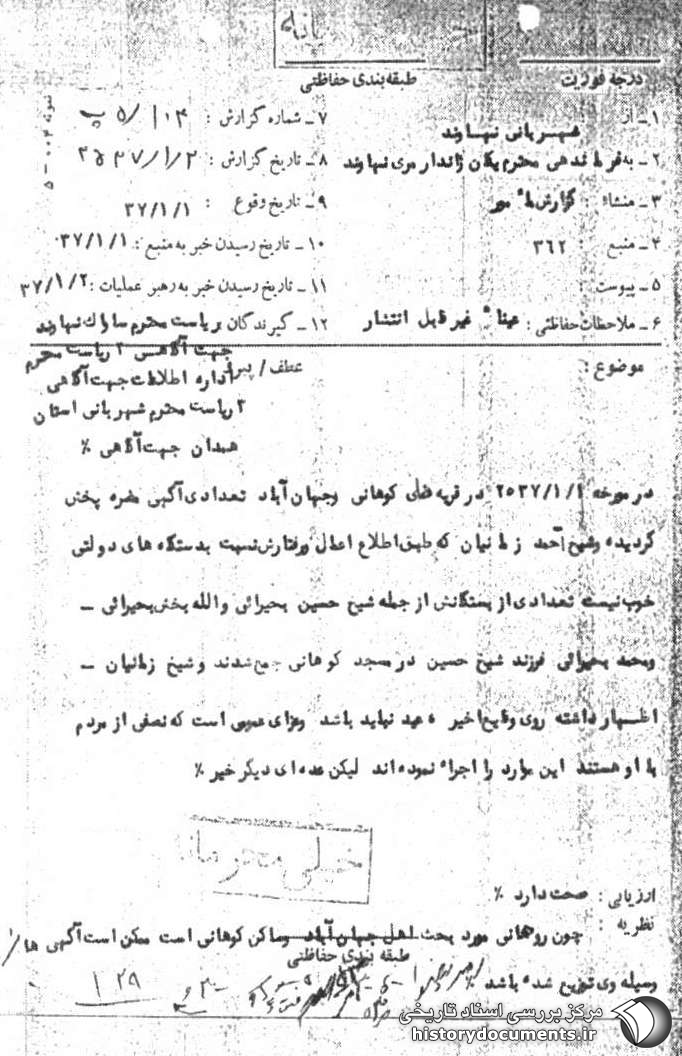 در مورخه 1 /1 /2537 در قریههای کوهانی و جهانآباد تعدادی آگهی مضره پخش گردیده و شیخ احمد زمانیان که طبق اطلاع اعمال و رفتاریش نسبت به دستگاههای دولتی خوب نیست تعدادی از بستگانش از جمله شیخ حسین بحیرایی و اله بخش بحیرایی و محمد بحیرایی فرزند شیخ حسن در مسجد کوهانی جمع شدند و شیخ زمانیان اظهار داشته روی وقایع اخیر عید نباید باشد و عزای عمومی است که نصفی از مردم با او هستند این موارد را اجرا نمودهاند لیکن عدهای دیگر خیر.