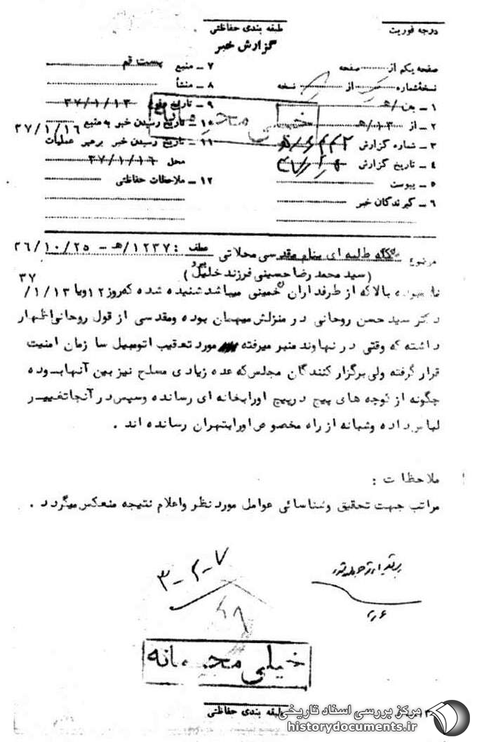 نامبرده بالا که از طرفداران خمینی میباشد شنیده شده که روز ۱۲ یا 13 /1 /37 دکتر حسن روحانی در منزلش میهمان بوده و مقدسی از قول روحانی اظهار داشته که وقتی در نهاوند به منبر میرفته مورد تعقیب اتومبیل سازمان امنیت قرار گرفته ولی برگزار کنندگان مجلس که عده زیادی مسلح نیز بین آنها بوده چگونه از کوچههای پیچ در پیچ او را به خانهای رسانده و سپس در آن جا تغییر لباس داده و شبانه از راه مخصوص او را به تهران رساندهاند.