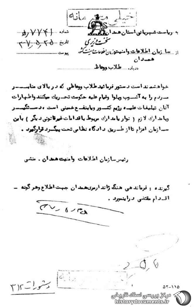 گیرنده: فرماندهی هنگ ژاندارمری همدان جهت اطلاع و هر گونه اقدام مقتضی در این مورد.