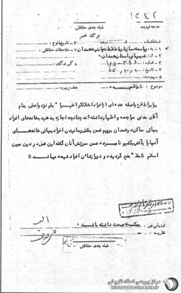 برابر اطلاع واصله عدهای از افراد اخلالگر اخیراً به قم نزد واعظی به نام آقای مدنی مراجعه و اظهار داشتهاند چنانچه اجازه بدهید به خانههای افراد بهائی ساکن در همدان برویم ضمن به قتل رسانیدن افراد بهائی خانههای آنها را به آتش بکشیم نامبرده ضمن سرزنش آنان گفته این عمل در دین مبین اسلام کاملاً منع گردیده و دور از شأن افراد شیعه میباشد.