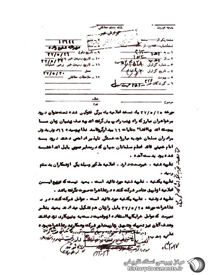 مورخه 25 /5 /37 یک نسخه اعلامیه یک برگی فتوکپی شده تحت عنوان درود بر خواهران مبارز که راه زینب را در پیش گرفتهاند و به صف زینبیان زمان ما پیوستهاند و با افشاء جنایات 66 بیدارگر و فاسد نظام پوسیده 66 دوش به دوش برادران مسلمان خود به مبارزات خستگیناپذیر ادامه میدهند درود به امام خمینی قائد اعظم مسلمانان جهان که در معابر عمومی بابل انداخته شده بود به دست آمده[است].
