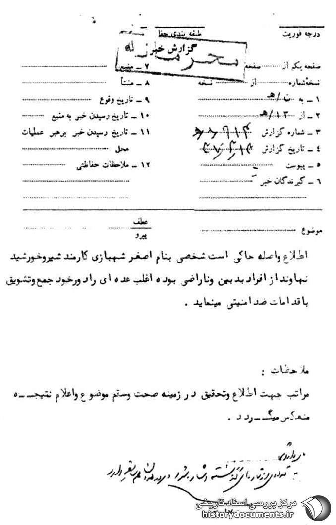 اطلاع واصله حاکی است شخصی به نام اصغر شهبازی کارمند شیر و خورشید نهاوند از افراد بدبین و ناراضی بوده اغلب عدهای را دور خود جمع و تشویق به اقدامات ضد امنیتی مینماید.