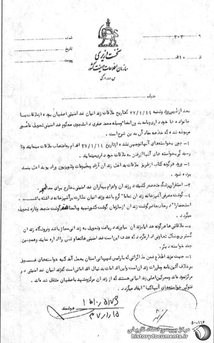 برابر گزارش دایره مربوطه ساعت ۱۶:۰۰ روز 14 /1 /37 که طبق معمول اسامی زندانیان ضد امنیتی به وسیله بلندگو اعلام که جهت ملاقات با بستگان خود به اطاق ملاقات مراجعه نمایند زندانیان مزبور از مراجعه خودداری و معروضهای بدون امضاء وسیله زندانی ضد امنیتی محمد صفری سیچانی که فتوکپی آن پیوست میباشد ارائه ضمنأ وسیله افسر زندان با ارائه دهنده ابلاغ گردیده نامبرده و سایر زندانیان سیاسی نبوده بلکه برابر قرار و آراء صادره از دادگاه به علت اقدام علیه امنیت کشور بازداشت و زندانی میباشند، همچنین خانواده آنان با اطلاع از عدم تمایل زندانیان به ملاقات بدون هیچ گونه برخوردی زندان را ترک نمودند مراتب جهت آگاهی و اقدام لازم اعلام میگردد.