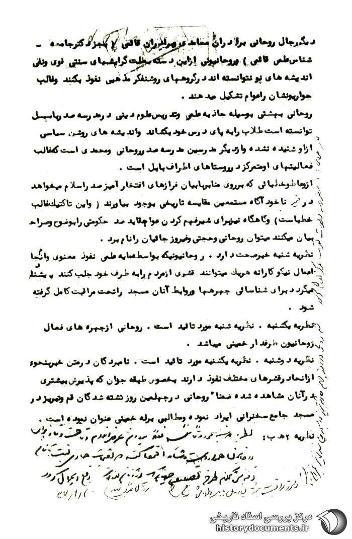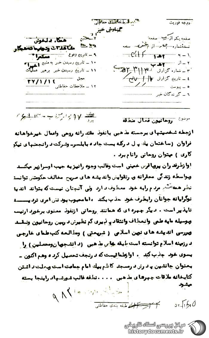 نظریه شنبه: خبر صحت دارد. روحانیونی که به واسطه مایهی علمی نفوذ معنوی و آنجام اعمال نیکوکارانه هریک میتوانند قشری از مردم را به طرف خود جلب کنند پیشنهاد میگردد برای شناسایی چهرهها و روابط آنان مسجد را تحت مراقبت کامل گرفته شود.