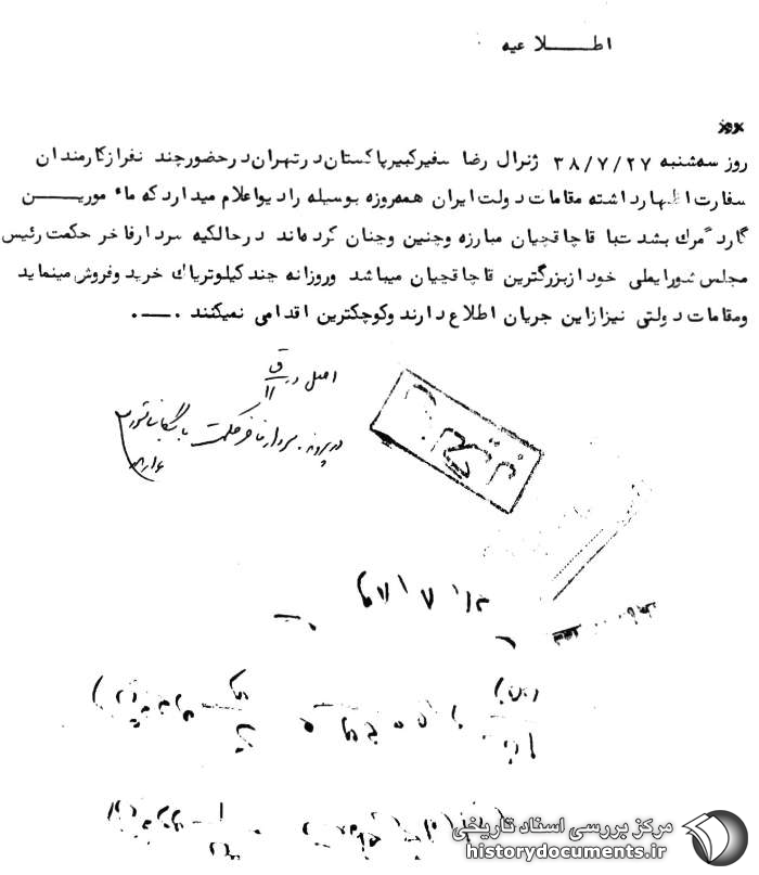 روز سه شنبه 27 /7 /38 ژنرال رضا سفیر کبیر پاکستان در تهران در حضور چند نفر از کارمندان سفارت اظهار داشته مقامات دولت ایران همه روزه به وسیله رادیو اعلام میدارد که مأمورین گارد گمرک به شدت با قاچاقچیان مبارزه و چنین و چنان کردهاند در حالی که سردار فاخر حکمت رئیس مجلس شورای ملی خود از بزرگترین قاچاقچیان میباشد و روزانه چند کیلو تریاک خرید و فروش مینماید و مقامات دولتی نیز از این جریان اطلاع دارند و کوچکترین اقدامی نمیکنند.