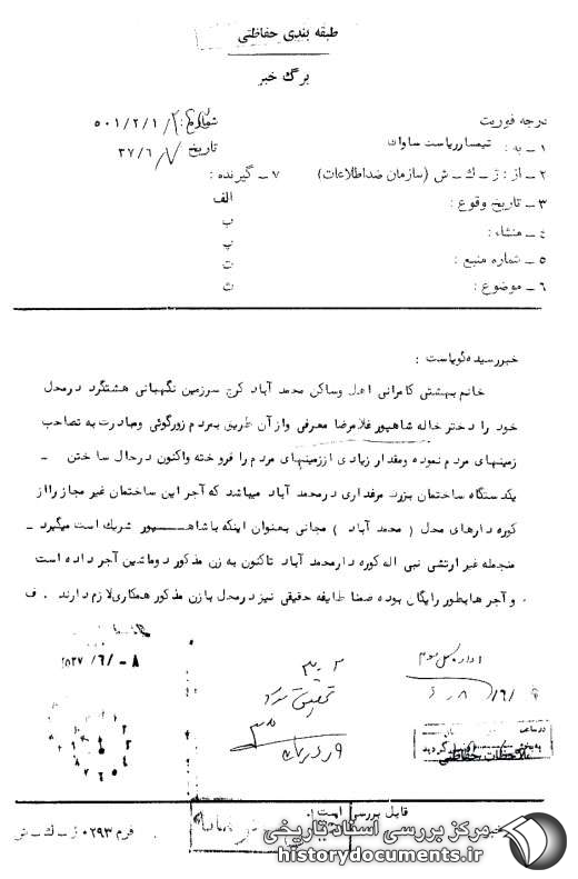 خانم بهشتی کامرانی، اهل و ساکن محمدآباد کرج، سر زمین نگهبانی هشتگرد در محل، خود را دختر خاله شاهپور غلامرضا معرفی و از آن طریق به مردم زورگویی و مبادرت به تصاحب زمینهای مردم نموده و مقدار زیادی از زمینهای مردم را فروخته و اکنون در حال ساختن یک دستگاه ساختمان بزرگ مرغداری در محمدآباد میباشد که آجر این ساختمان غیرمجاز را از کورهدارهای محل (محمدآباد) مجانی بهعنوان اینکه با شاهپور شریک است، میگیرد. منجمله غیر ارتشی نبیاله کورهدار محمدآباد تاکنون به زن مذکور دو ماشین آجر داده است و آجرها بهطور رایگان بوده. ضمناً طایفه حقیقی نیز در محل با زن مذکور همکاری لازم دارند.