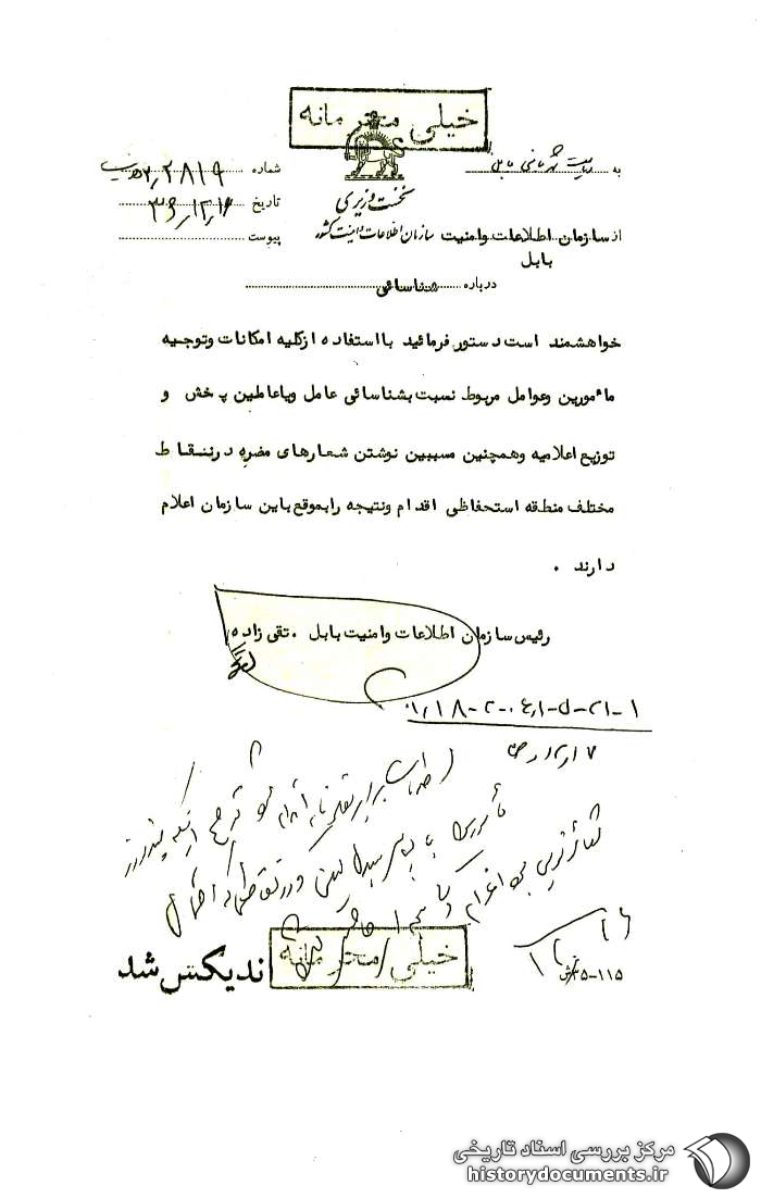 خواهشمند است دستور فرمایید با استفاده از کلّیه امکانات و توجیه مأمورین و عوامل مربوط نسبت به شناسایی عامل و یا عاملین پخش و توزیع اعلامیه و همچنین مسبّبین نوشتن شعارهای مضرّه در نقاط مختلف منطقهی استحفاظی اقدام و نتیجه را به موقع به این سازمان اعلام دارند.