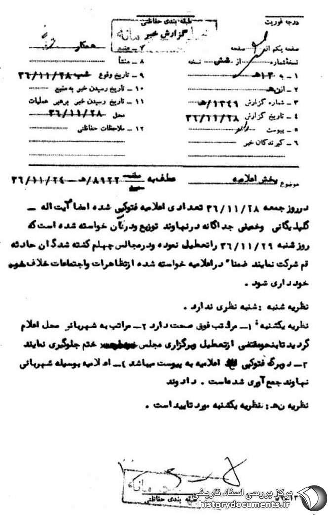 نظریه یکشنبه: ۱- مراتب فوق صحت دارد ۲- مراتب به شهربانی محل اعلام گردید تا به نحو مقتضی از تعطیل و برگزاری مجلس ختم جلوگیری نمایند. 3- دو برگ فتوکپی اعلامیه به پیوست میباشد. 4- اعلامیه به وسیله شهربانی نهاوند جمعآوری شده است. دادوند