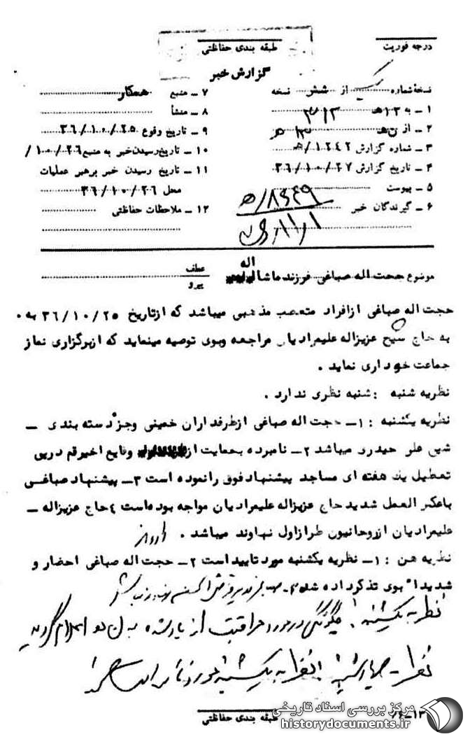 نظر ه ن: ۱- نظریه یکشنبه مورد تایید است ۲- حجتاله صباغی احضار و شدیداً به وی تذکر داده میشود.