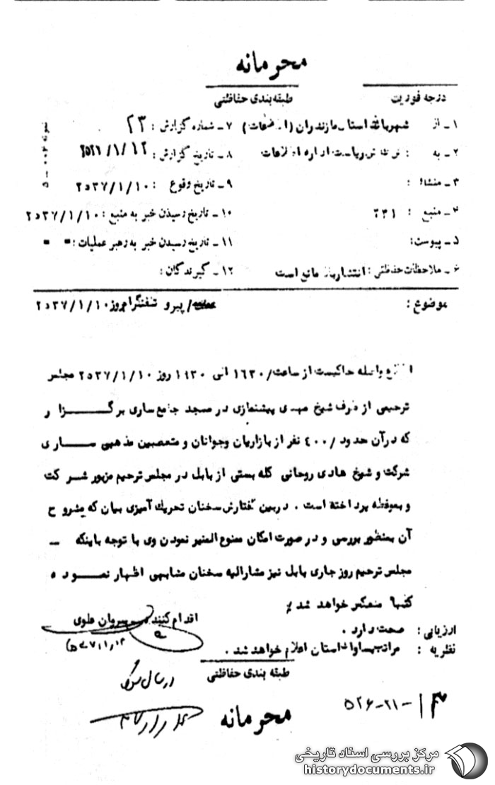 اطلاع واصله حاکی است از ساعت 1630 الی 1930 روز 10 /1 /2537 مجلس ترحیمی از طرف شیخ مهدی پیشنمازی در مسجد جامع ساری برگزار که در آن حدود 400 نفر از بازاریان و جوانان و متعصّبین مذهبی ساری شرکت و شیخ هادی روحانی کلهبستی از بابل در مجلس ترحیم مزبور شرکت و به موعظه پرداخته است. در بین گفتارش سخنان تحریکآمیزی بیان که مشروح آن به منظور بررسی و در صورت امکان ممنوعالمنبر نمودن وی باتوجه به اینکه [در] مجلس ترحیم روز جاری بابل نیز مشارالیه سخنانی مشابهی اظهار نموده کتباً منعکس خواهد شد.