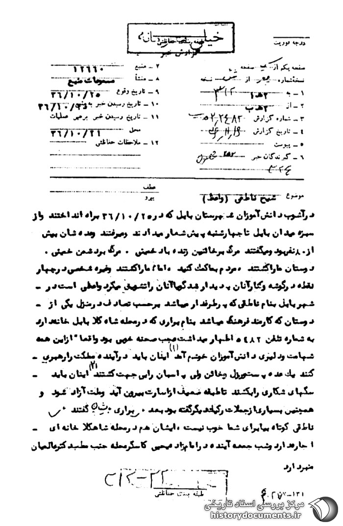 3. ساواک مازندران، پس از دریافت این گزارش، طی نامه شماره: 3293 /2ﻫ1 - 24 /11 /36 دستور داد: «مشخصات کامل ملصق به عکس نامبرده بالا را تهیه و به این سازمان ارسال نمایند.» و اداره کل سوم نیز پس از دریافت این گزارش، طی نامه شماره: 8831 /312 – 7 /12 /36 به ساواک مازندران نوشت: «دستور فرمایید ضمن توجیه منابع مربوطه مبنی بر ذکر حداقل نام و نام خانوادگی سوژهها در گزارشات خود، به نحو مقتضی از منابر نامبرده بالا مراقبت، چنانچه مجدداً اظهارات خلاف و تحریکآمیزی ایراد نمود باتوجه به نظریـه 2ﻫ ب اقدام و نتایج حاصله را همراه با تهیه و ارسال مشخصات کامل ملصق به عکس وی اعلام دارند.»