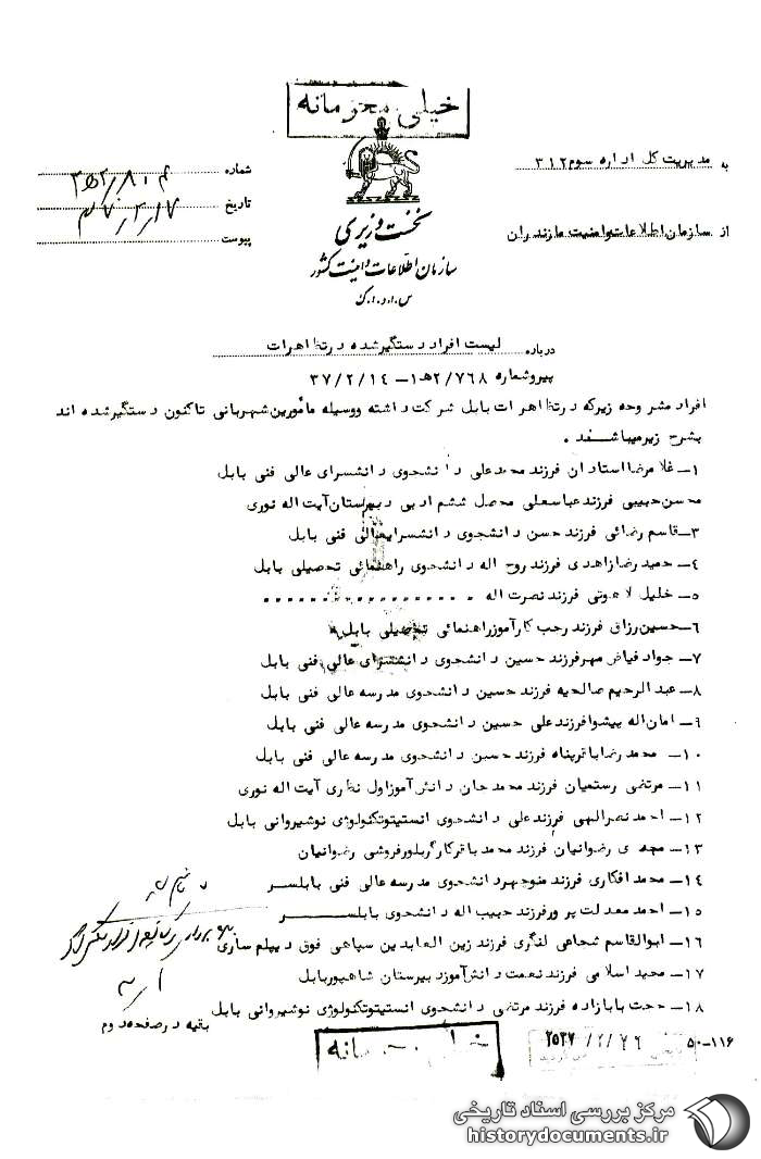 افراد مشروحه زیر که در تظاهرات بابل شرکت داشته و وسیله مأمورین شهربانی تاکنون دستگیر شدهاند به شرح زیر میباشند: