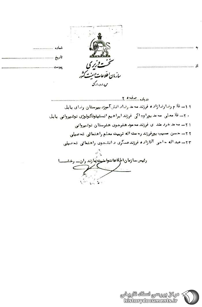 2. اداره کل سوم پس از دریافت این گزارش، طی شماره: 3287 / 312 - 17 /3 /37 به ساواک مازندران نوشت: «افراد مورد بحث در نامه بازگشتی فوق همگی دانشجو و دانشآموز میباشند (به جز ردیف13)، لذا میبایستی نامه معطوفی به بخشهای ذینفع (323 – 324) و گیرنده به بخش 312 اعلام میگردید. علیهذا خواهشمند است دستور فرمائید نتیجه تحقیقات معموله از افراد دستگیر شده و سرآنجام کار آنها همراه با تهیه و ارسال مشخصات کامل ملصق به عکس آنها به این اداره کل ( 323 – 324 – 312) اعلام دارند.»