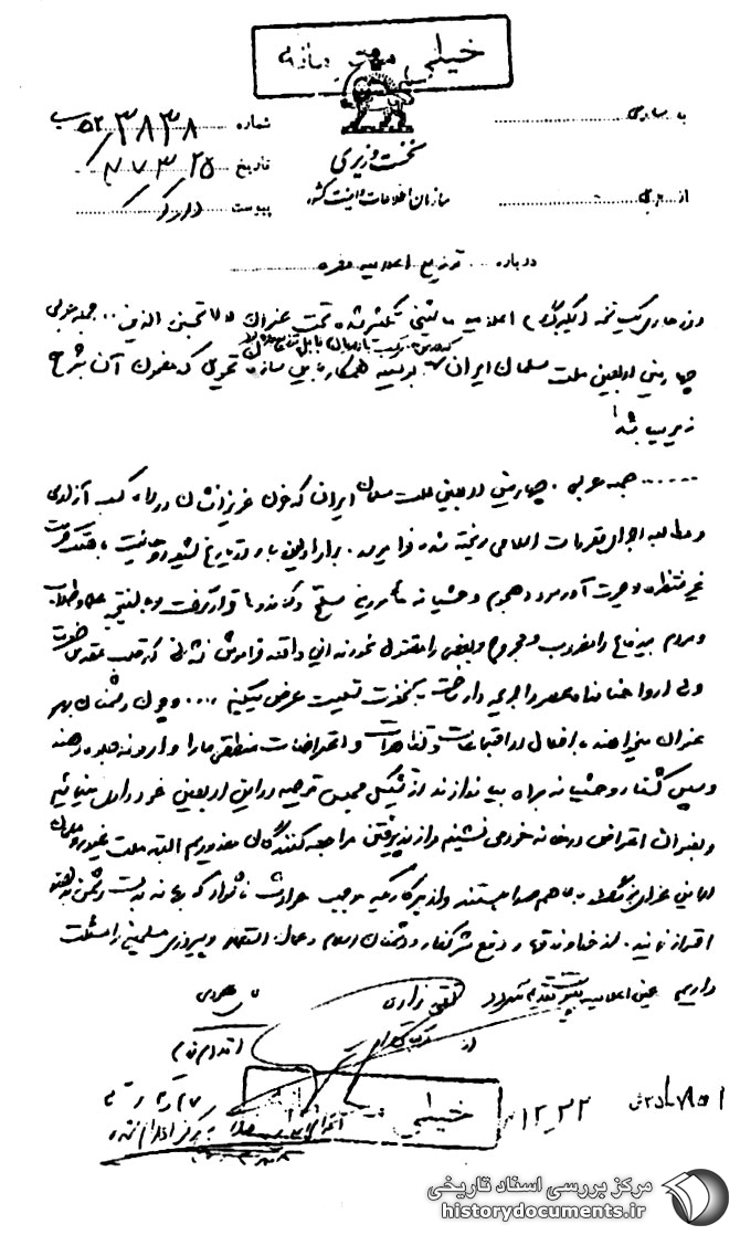 ....جمله عربی. چهارمین اربعین ملت مسلمان ایران که خون عزیزانشان در راه کسب آزادی و مطالبه اجرای مقررات اسلامی ریخته شده فرا میرسد. برای اولین بار در تاریخ شیعه روحانیت با هتک حرمت غیرمنتظره و حیرتآور مورد هجوم وحشیانه مأمورین مسلح و کماندوها قرار گرفت و بالنتیجه علما و طلّاب و مردم بیدفاع را مضروب و مجروح و بعضی را مقتول نمودند این واقعه فراموشنشدنی که قلب مقدس حضرت ولی ارواحنا فداه عصر [ولی عصر ارواحنا فدا] را جریحهدار ساخت به آن حضرت تسلیت عرض میکنیم... و چون دشمنان به هر عنوان میخواهند با اخلال در اجتماعات و تظاهرات و اعتراضات منطقی ما را وارونه جلوه دهند و سپس کشتار وحشیانه به راه بیاندازند از تشکیل مجلس ترحیم در این اربعین خودداری مینمائیم و به عنوان اعتراض در خانه خود مینشینیم و از پذیرفتن مراجعهکنندگان معذوریم البته ملّت غیور و مسلمان در این عزای بزرگ با ما هم صدا هستند و از هر کاریکه موجب حوادث ناگوار که بهانه به دست دشمن بدهند احتراز نمایند. از خداوند قهار دفع شر کفار و دشمنان اسلام و عمال استعمار و پیروزی مسلمین را مسئلت داریم. تقیزاده